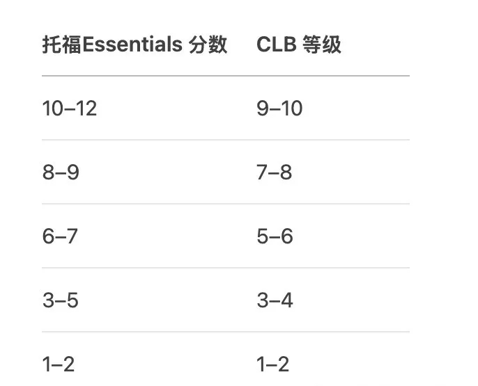 分数对照表虽未官宣,但据ETS透露,托福Essentials分数与CLB等级预计对应如下: